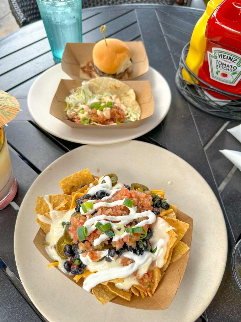 But what makes this place special is you’re sitting ON the sand. Actual sand. There are lawn games for kids (cornhole, giant Jenga), live music, and the food is legitimately good.