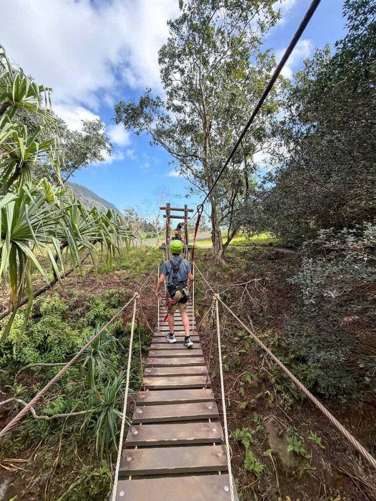 The zipline is officially called the Jurassic Valley Zipline. You get 7 zipline sections, 2 suspension bridges, and short hikes between each line, all inside Ka’a’awa Valley.