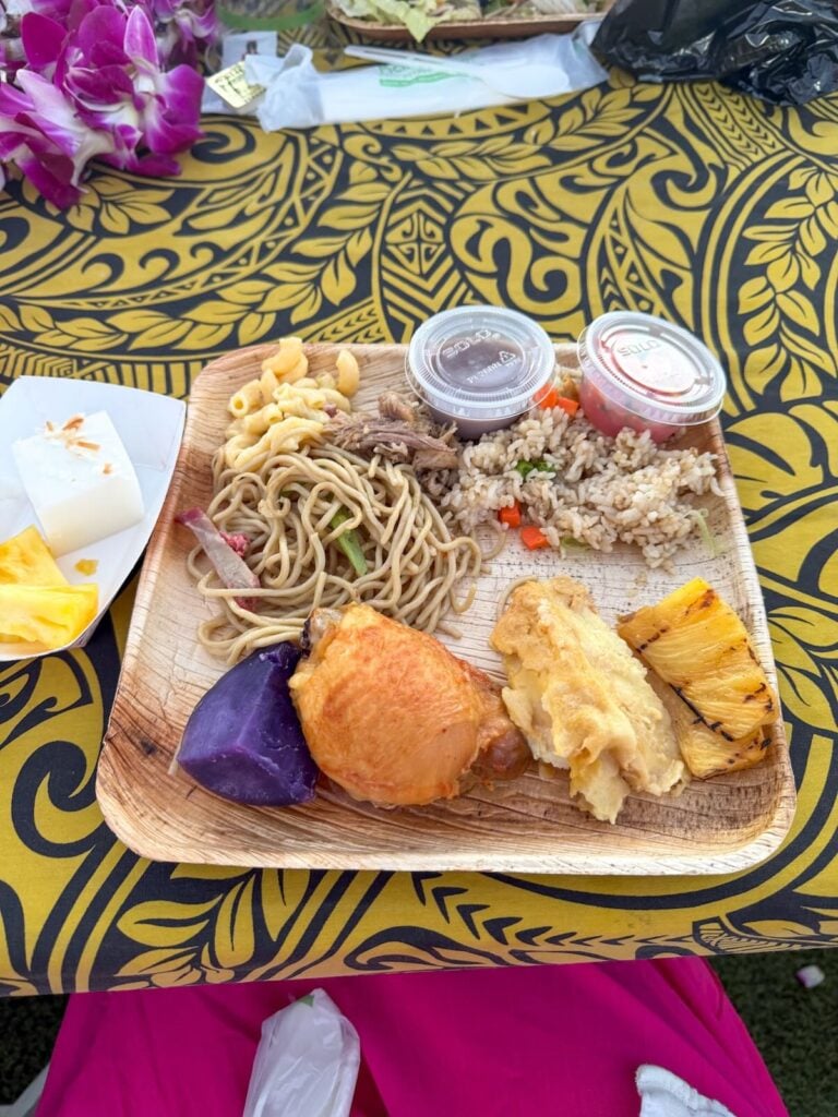 I had steamed fish, kalua pork, poi, lomi lomi salmon, noodles, fried rice, grilled pineapple, purple potato, and mac salad.