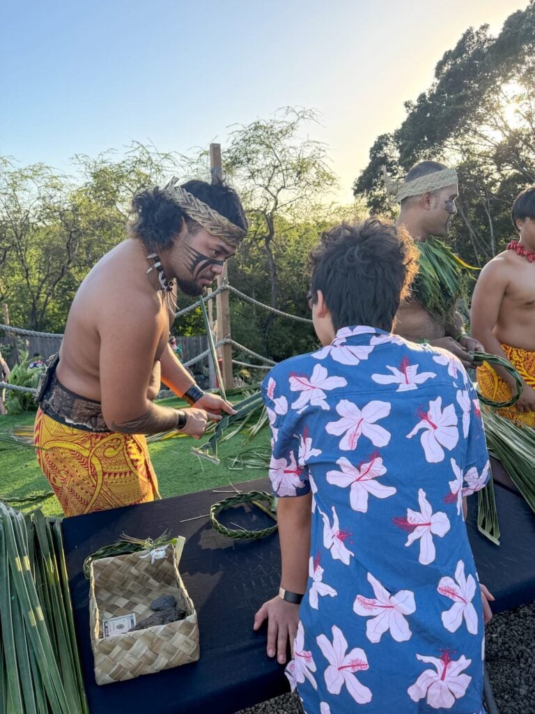 Options included coconut frond headband making (DIY or they’d do it for you), flower bracelet making, a cooking demonstration, photos with traditional weapons, a hula lesson, shaving coconut meat, and more.